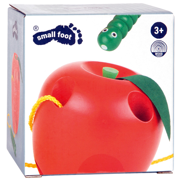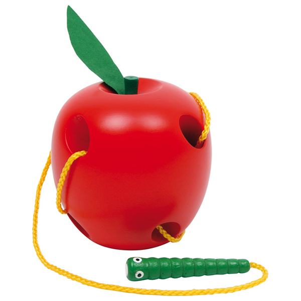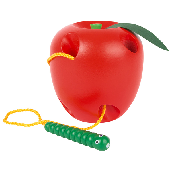 Houten rijgspel in de vorm van een appel.