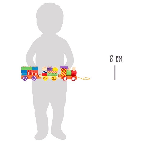 De locomotief en de twee wagons kunnen aan elkaar worden gekoppeld en achter zich aan worden getrokken door een touw.