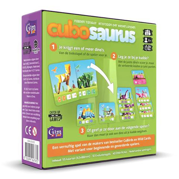In CuboSaurus verzamel je dino's. Met elke dino kun je op een andere manier punten verdienen, maar ook weer kwijtraken! Elke speler heeft een eigen strategie en heeft daarvoor bepaalde dino's nodig. Soms wil iedereen dezelfde dino en dan wordt het spannend!