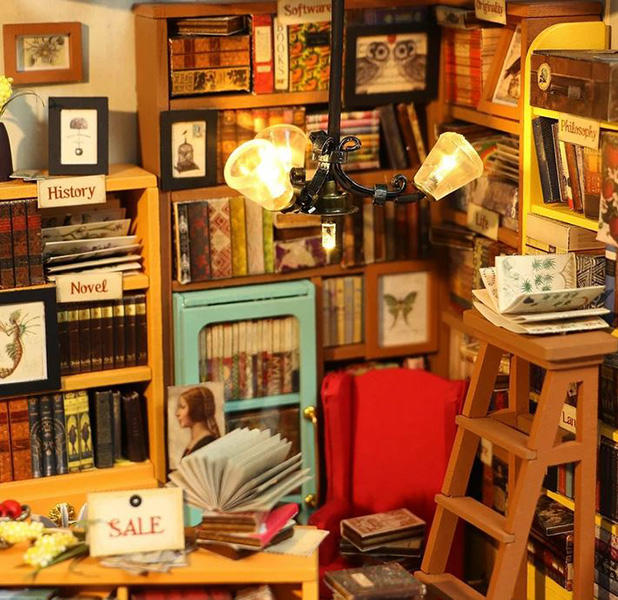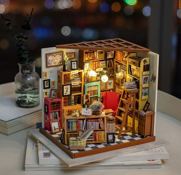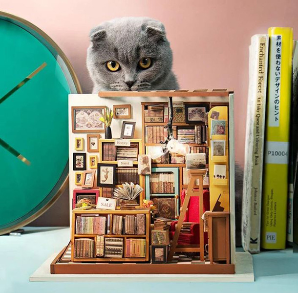 Ontdek deze ongelooflijk rijk gedetailleerde miniatuurkamer vol boeken en snuisterijen.