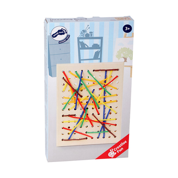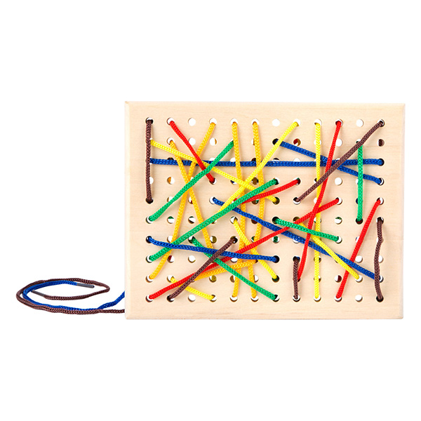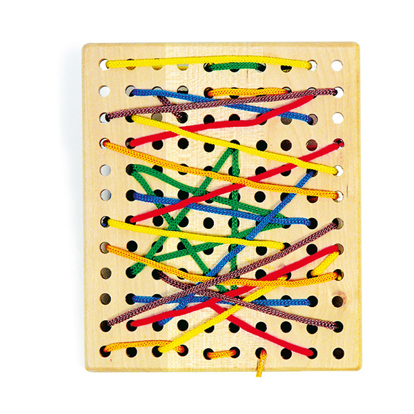 Door de gekleurde draadjes kriskras doorheen de gaatjes te friemelen verschijnt er een prachtig gekleurd abstract kunstwerk. Is het kind al wat groter, kan je natuurlijk letters, cijfers, een huisje... eigenlijk alles waar je aan denkt in beeld brengen (zelfs leren schoenen strikken kan je hiermee oefenen).