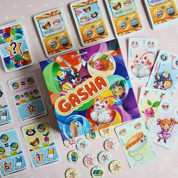 Het vrolijke thema van Gasha is gebaseerd op de Japanse Gashapon-traditie: automaten waar je in ruil voor een muntje een plastic bal met een speeltje kunt trekken. Het spel is rijk geïllustreerd door Christine Alcouffe (Paper Tales, Yōkai) en Miguel Coimbra (7 Wonders, Small World) en is een lust voor het oog.