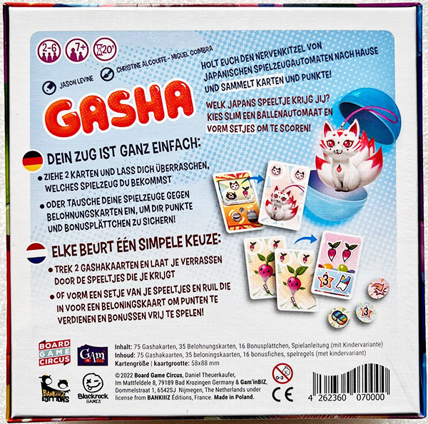 Wie kent die automaten met speeltjes in plastic ballen nou niet? Het is altijd spannend wat je zal krijgen. In Gasha beleef je die spanning in een gestroomlijnd verzamelspel dat leuk is voor jong en oud. Elke beurt trek je 2 kaarten. Op de achterkant van elke kaart zie je welke speeltjes je kunt krijgen. Kies de goede automaten en vorm van de speeltjes die je krijgt setjes die je kunt inwisselen voor punten en bonussen.