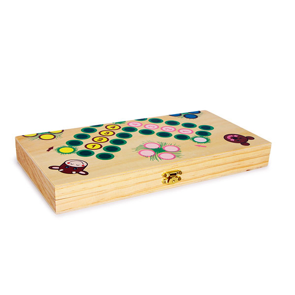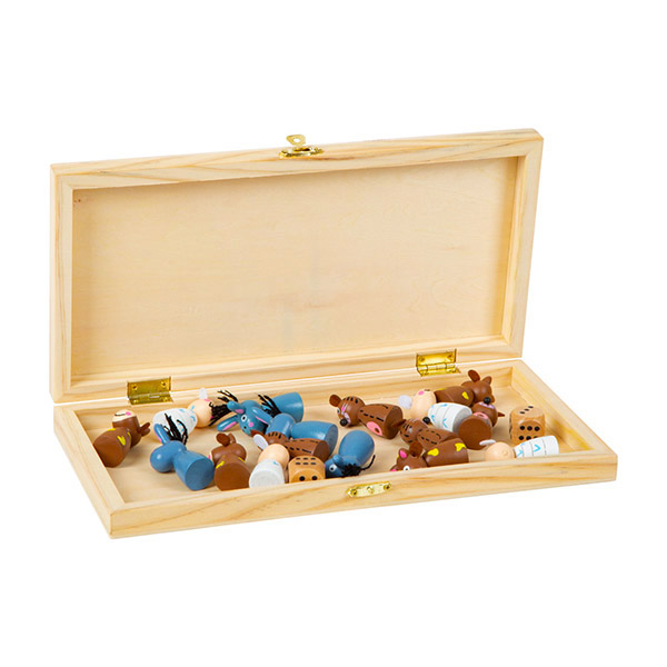 Volledig in hout, en alle onderdelen kunnen veilig opgeborgen worden in de afsluitbare doos.