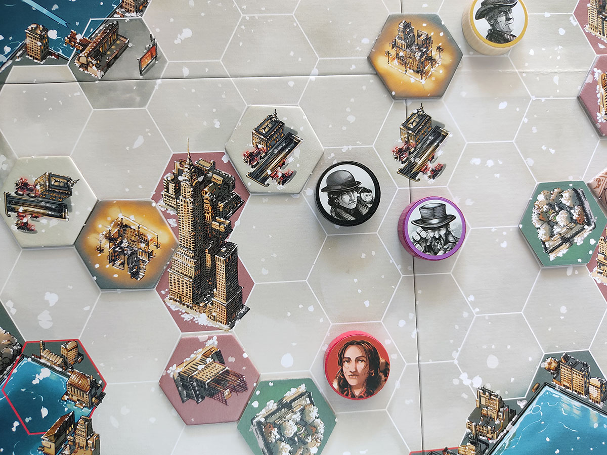 Verschillende verdachte personen bewegen zich over het spelbord, elk met hun eigen speciale eigenschappen.