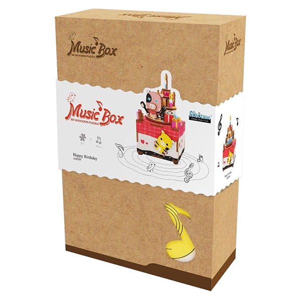 Inhoud: 63 houten onderdelen, asjes, opwindsysteem, muziekmechanisme en een duidelijke handleiding. 73x85x130 mm in afgewerkte staat.