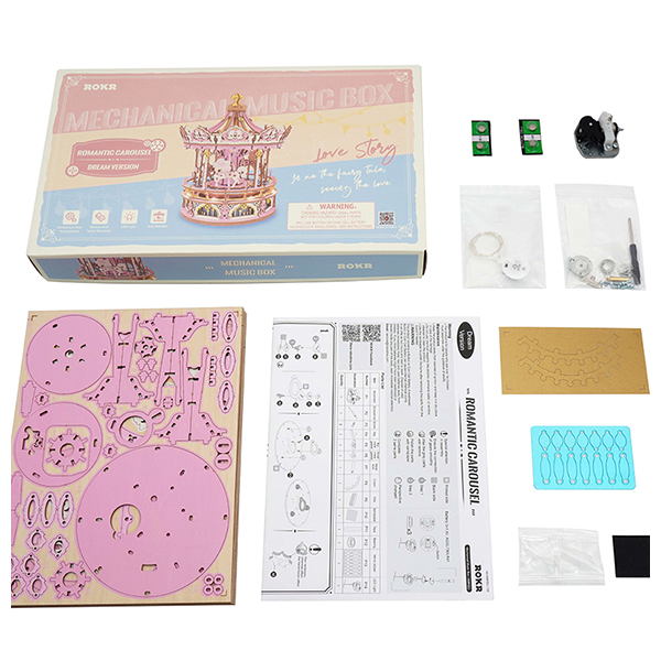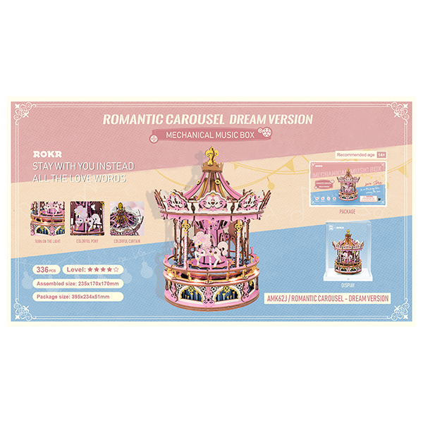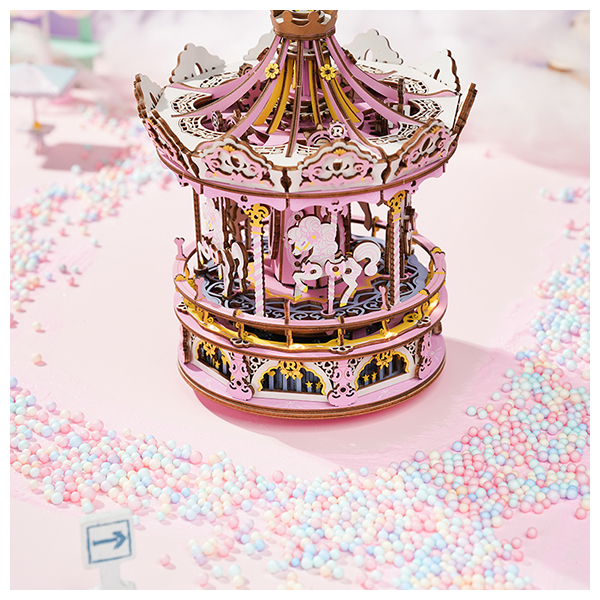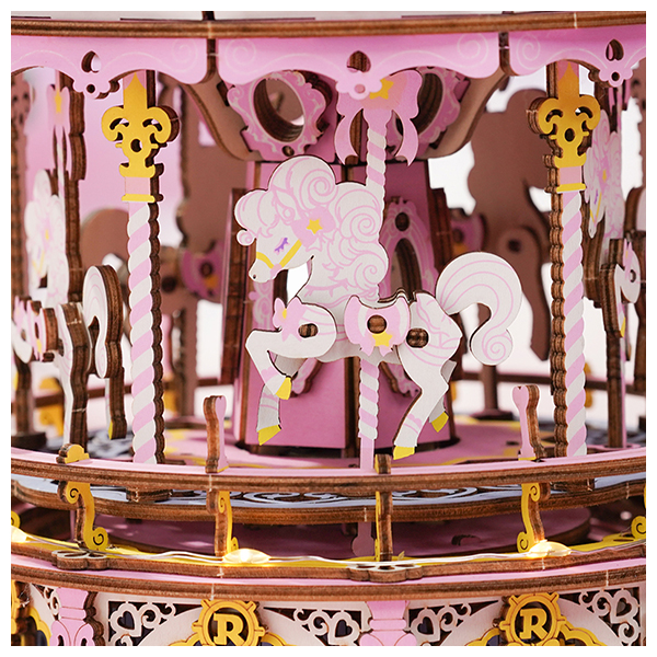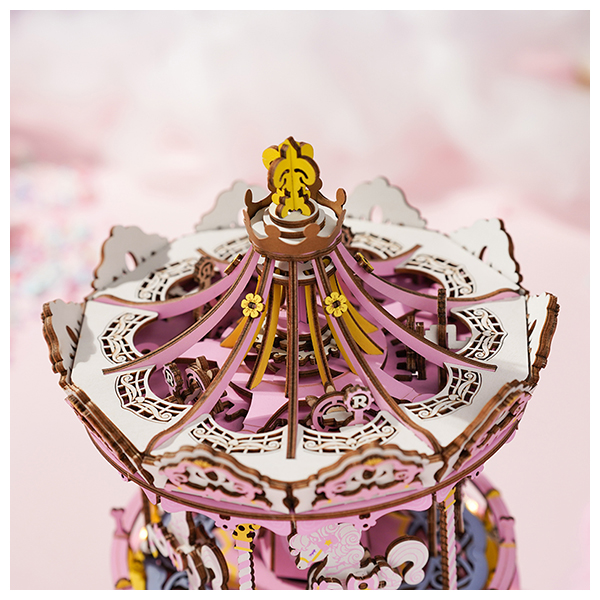 Maar met dit bouwpakket voor volwassenen haal jij de retrotijd weer terug! Die goede oude tijd met harten, sierlijsten en prachtige krullen zie je allemaal terugkomen in de romantisch carrousel dreamversion. Hij heet zo omdat dit houten bouwpakket dromerige kleurtjes heeft zoals: lichtblauw, roze en zachtgeel.