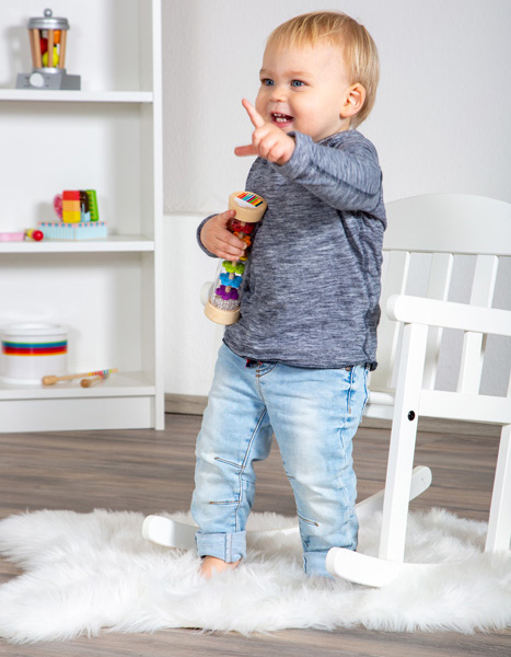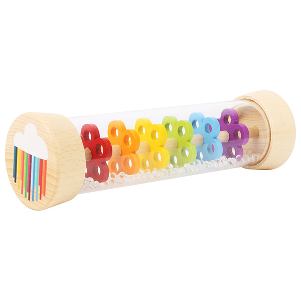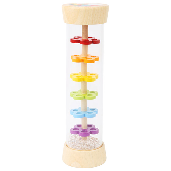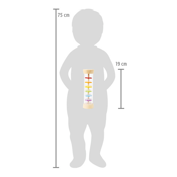 Hou je deze ondersteboven, dan valeen ze doorheen de kleurrijke hinernissen en maken zo een zacht ruisgeluid. Schud je harder, dan heb je een storm(pje) in een kokertje.