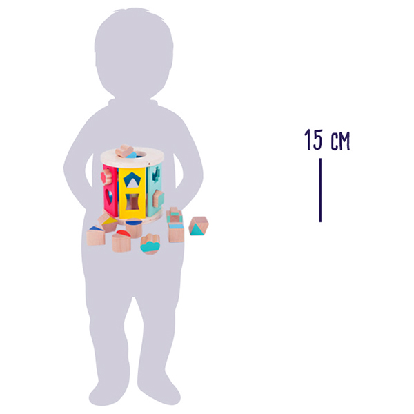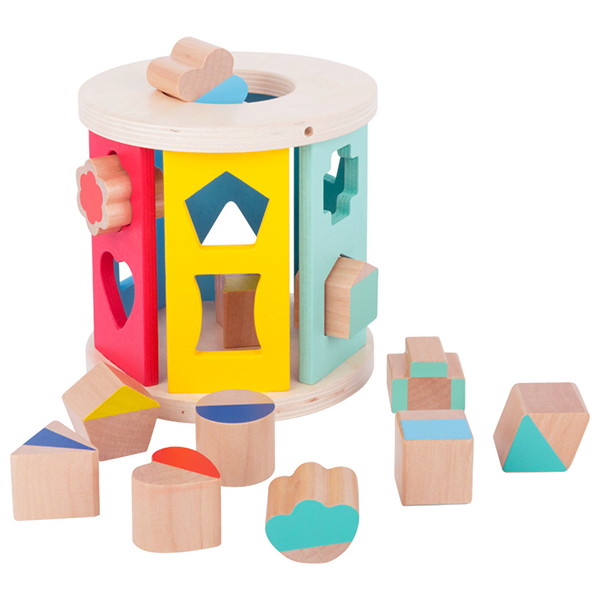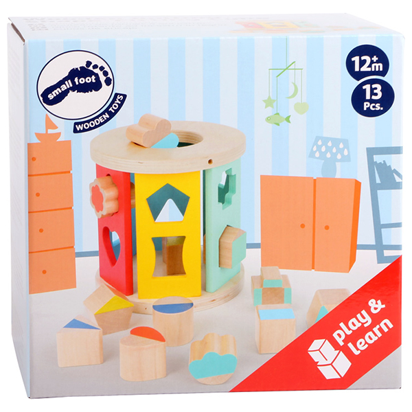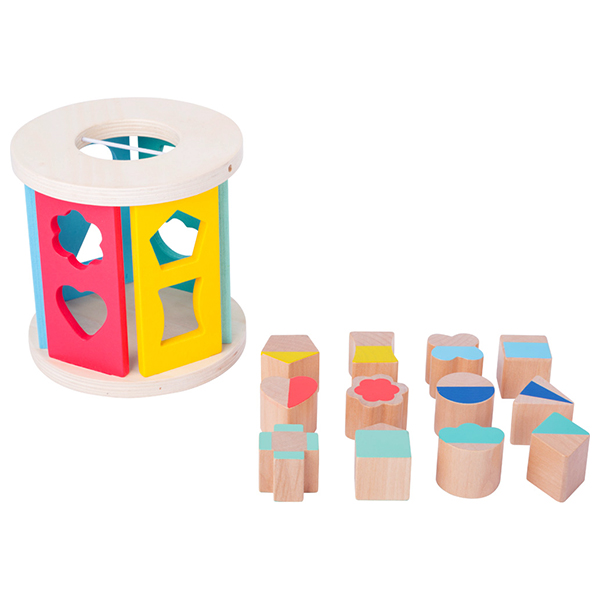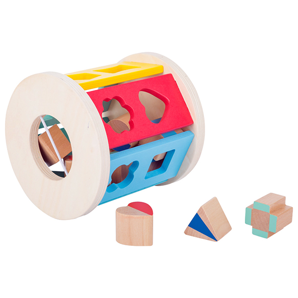De gedeeltelijk gelakte houten insteekblokken moeten in de juiste vormen worden gestoken en zo leert de kleuter spelenderwijs vormen herkennen.