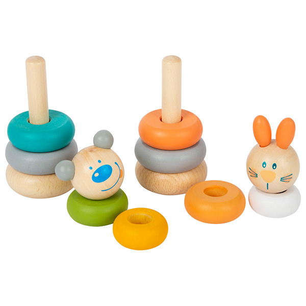 Dit peuterspeelgoed bevat 6 stapelbare houten donuts en 1 dierenkopje.