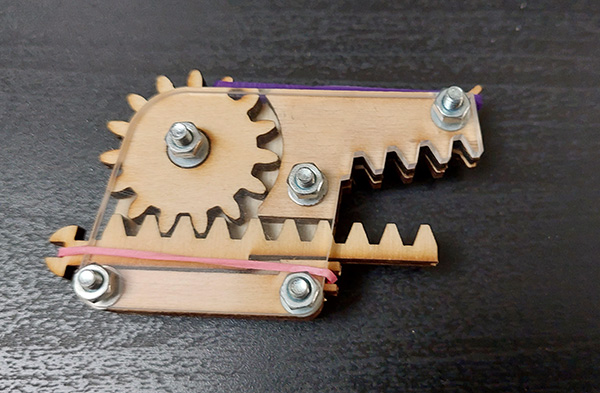 Dit klein toestelletje schiet loom-bandjes (kleine elastiekjes) af via een eenvoudig tandwielmechanisme dat je kan zien werken door het doorzichtige plexi-plaatje. Niet zo gevaarlijk als het klinkt, de rekkertjes vliegen een 4-tal meter.