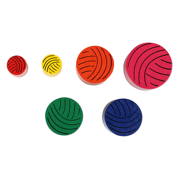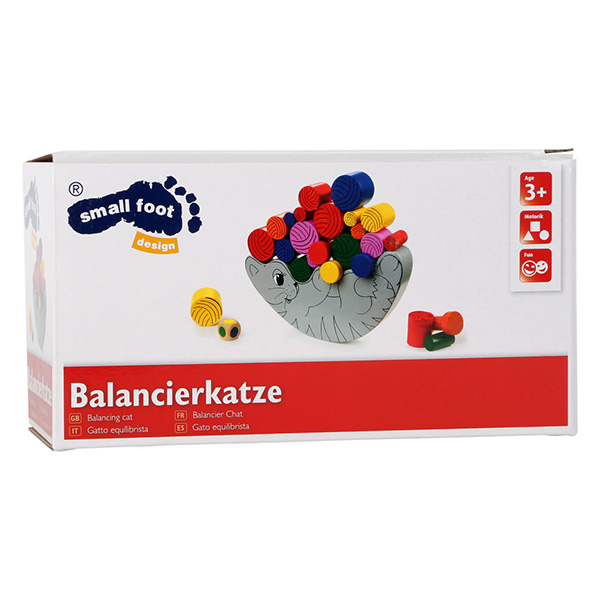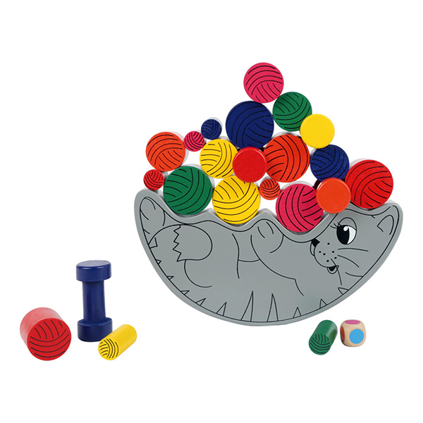 Minoe de poes ligt op zijn rug te spelen met de bolletjes wol. Aan de spelers om er zoveel mogelijk te stapelen en er vooral voor te zorgen dat alles mooi in evenwicht blijft want de bollen rollen graag overal naartoe.