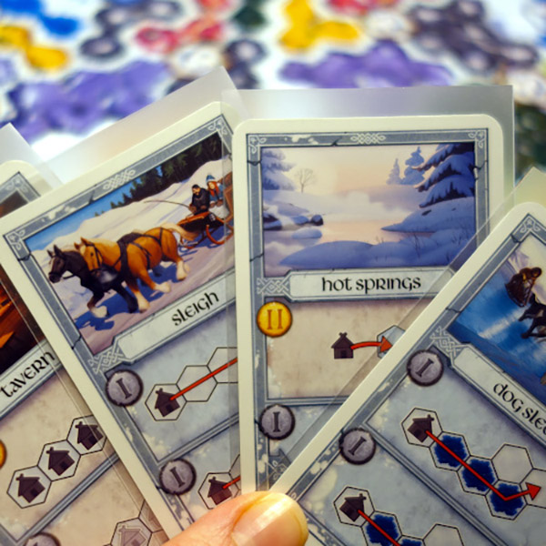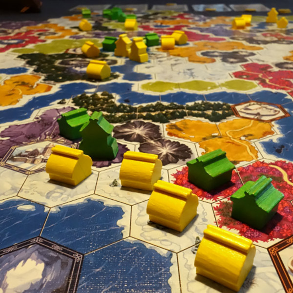 Plaats huizen en forten op het spelbord door kaarten te spelen, maar let er op dat jij alleen maar op jouw eigen type terrein mag bouwen.